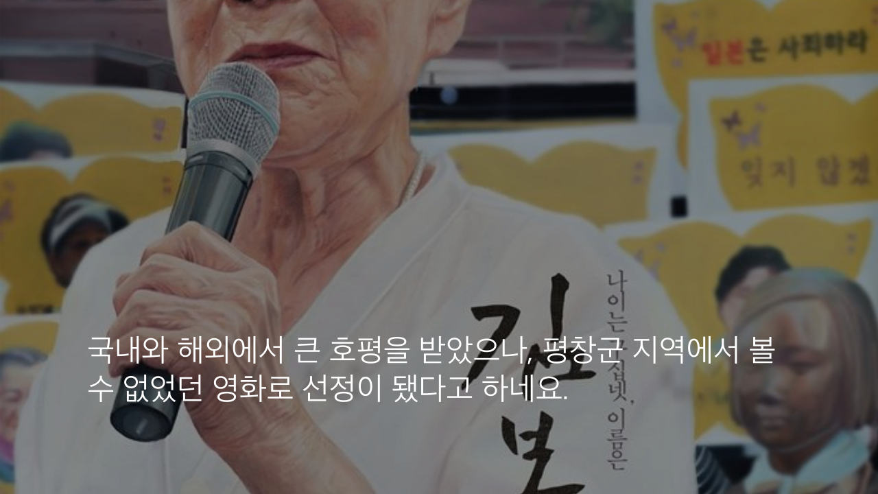 국내와 해외에서 큰 호평을 받았으나, 평창군 지역에서 볼 수 없었던 영화로 선정이 됐다고 하네요.
