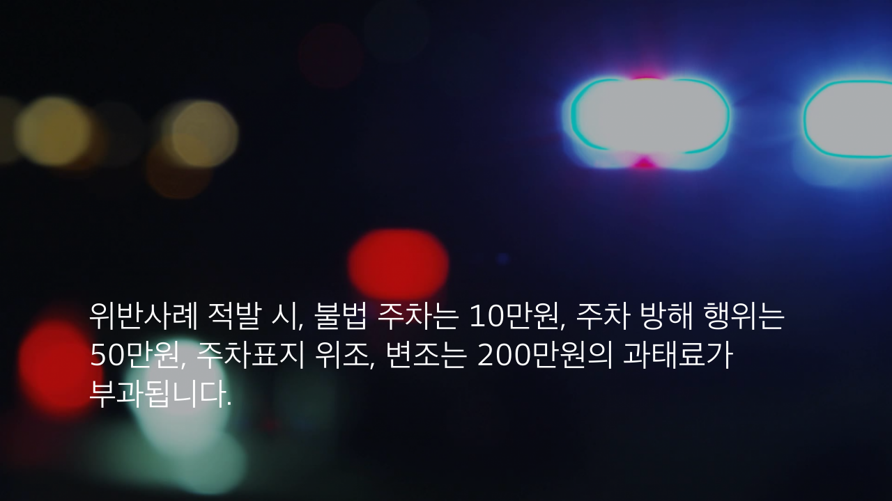 위반사례 적발 시, 불법 주차는 10만원, 주차 방해 행위는 50만원, 주차표지 위조, 변조는 200만원의 과태료가 부과됩니다.