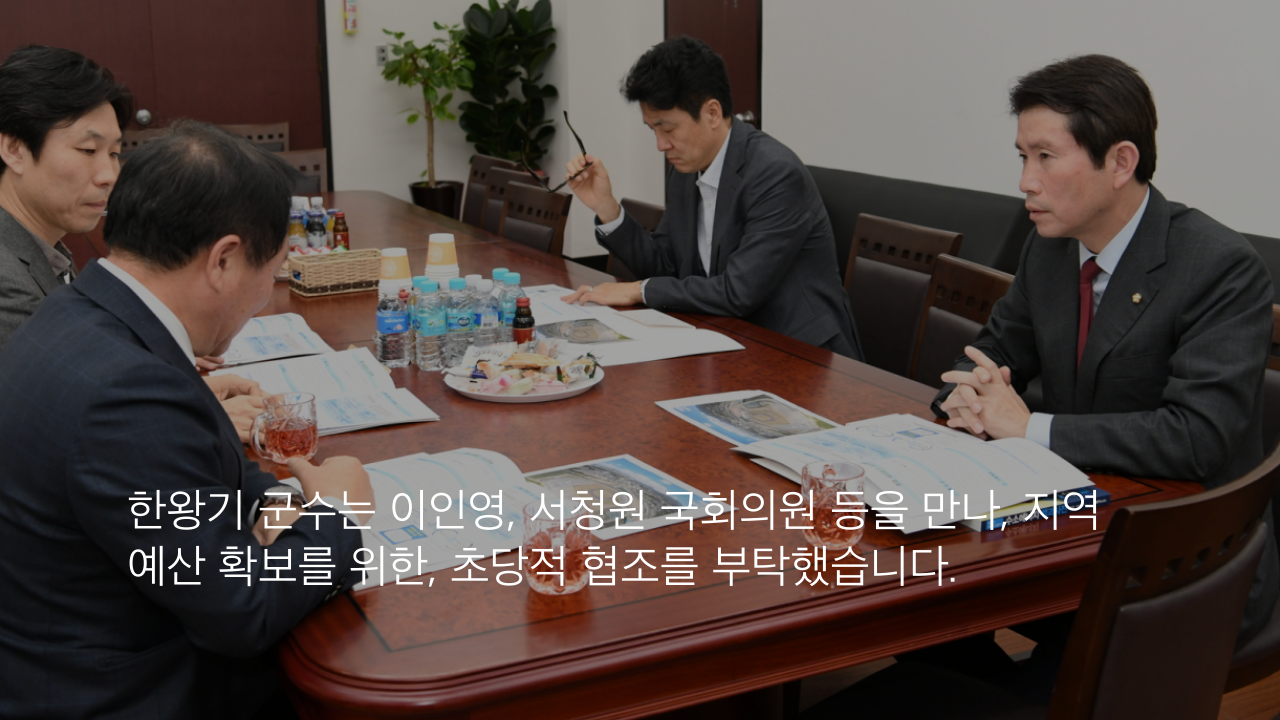 한왕기 군수는 이인영, 서청원 국회의원 등을 만나, 지역 예산 확보를 위한, 초당적 협조를 부탁했습니다.