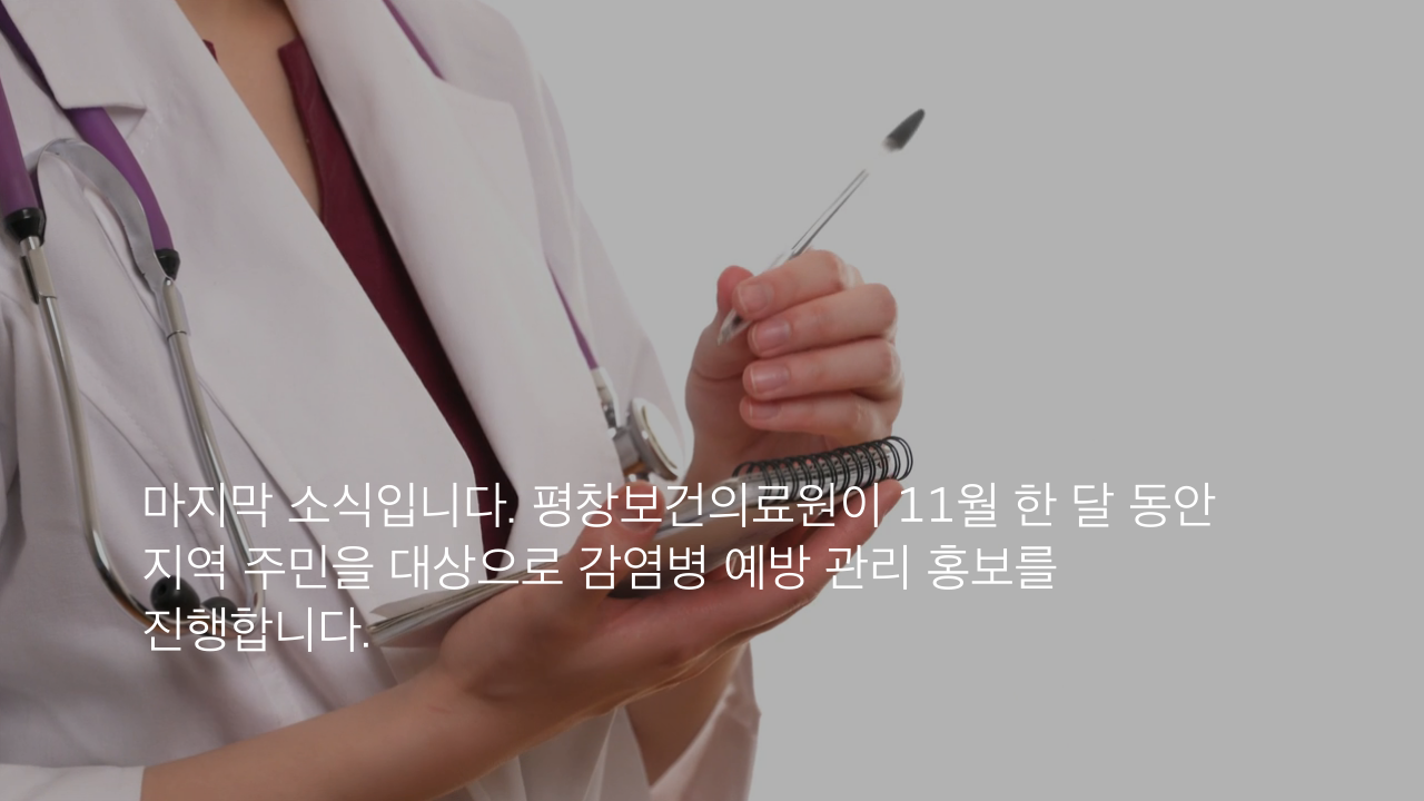 마지막 소식입니다. 평창보건의료원이 11월 한 달 동안 지역 주민을 대상으로 감염병 예방 관리 홍보를 진행합니다.