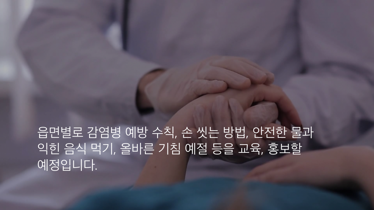 읍면별로 감염병 예방 수칙, 손 씻는 방법, 안전한 물과 익힌 음식 먹기, 올바른 기침 예절 등을 교육, 홍보할 예정입니다.