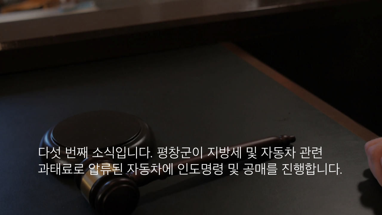 다섯 번째 소식입니다. 평창군이 지방세 및 자동차 관련 과태료로 압류된 자동차에 인도명령 및 공매를 진행합니다.