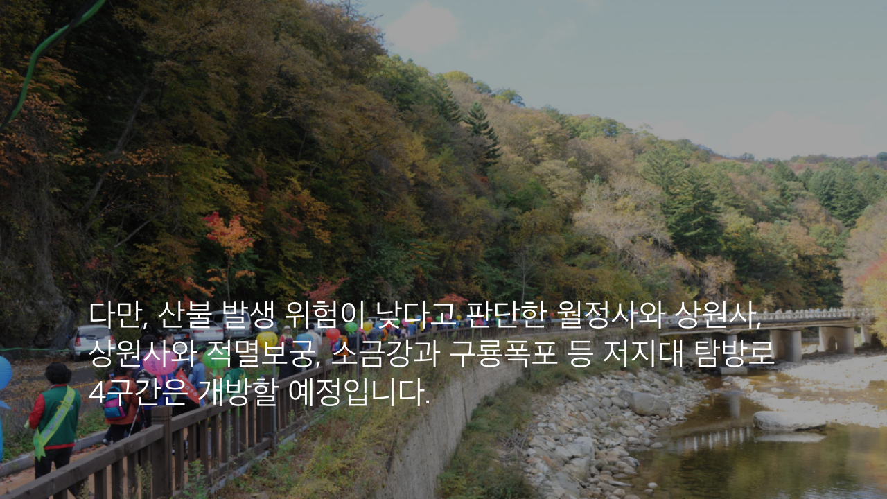 다만, 산불 발생 위험이 낮다고 판단한 월정사와 상원사, 상원사와 적멸보궁, 소금강과 구룡폭포 등 저지대 탐방로 4구간은 개방할 예정입니다.