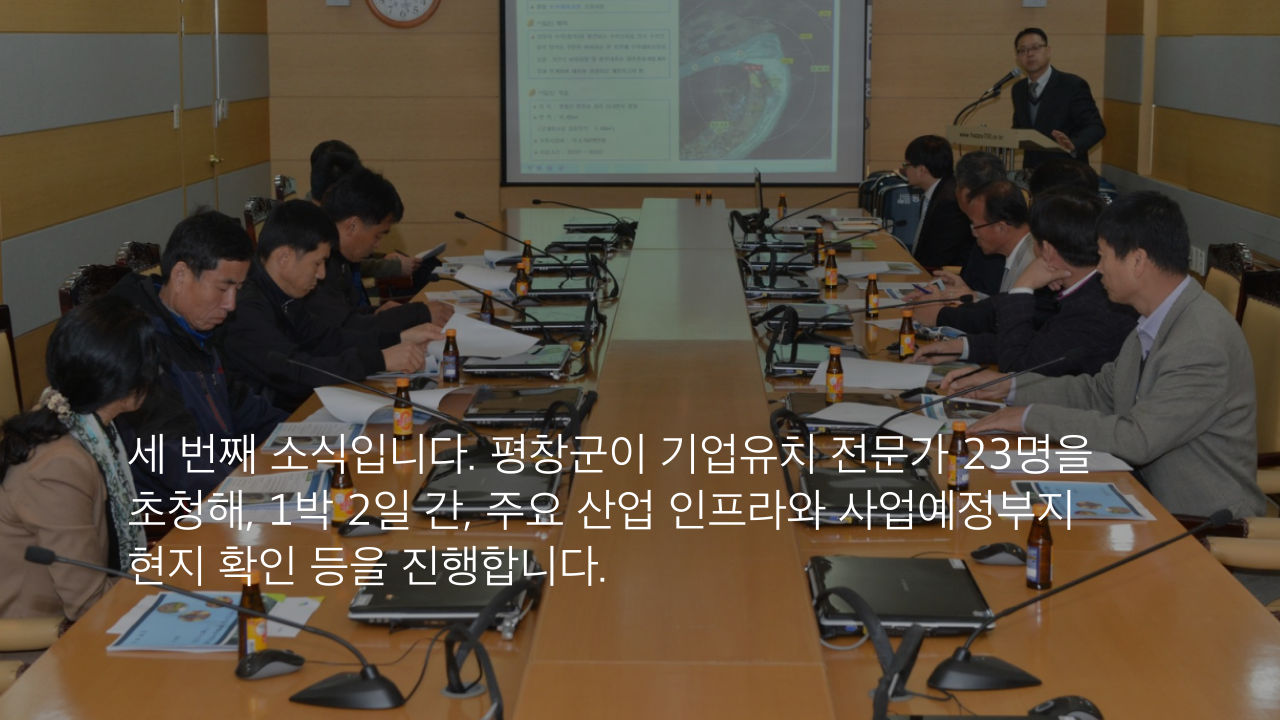 세 번째 소식입니다. 평창군이 기업유치 전문가 23명을 초청해, 1박 2일 간, 주요 산업 인프라와 사업예정부지 현지 확인 등을 진행합니다.