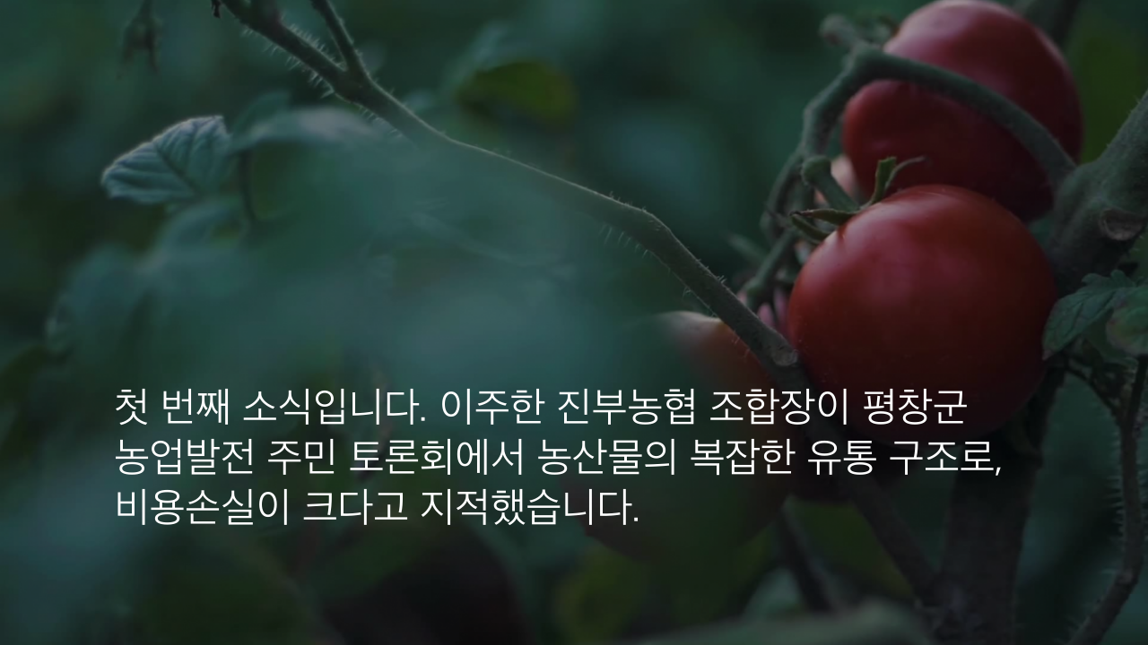 첫 번째 소식입니다. 이주한 진부농협 조합장이 평창군 농업발전 주민 토론회에서 농산물의 복잡한 유통 구조로, 비용손실이 크다고 지적했습니다.