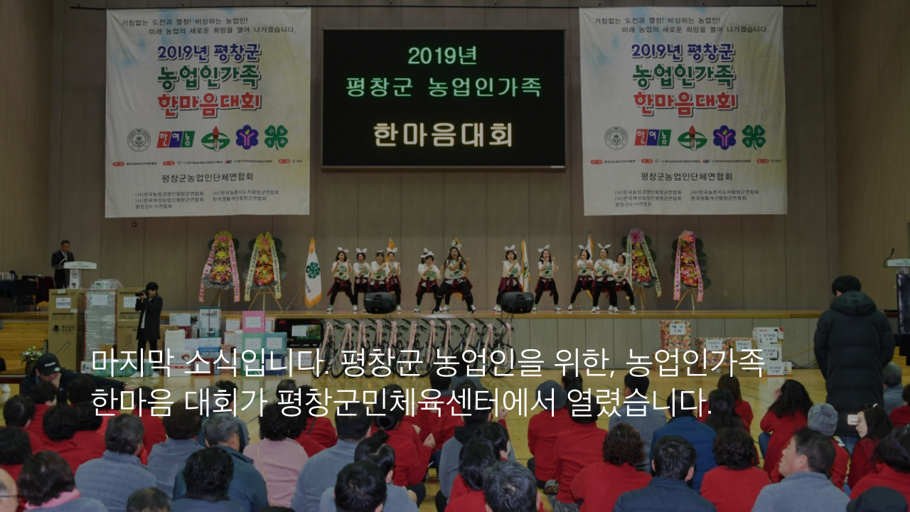 마지막 소식입니다. 평창군 농업인을 위한, 농업인가족 한마음 대회가 평창군민체육센터에서 열렸습니다.