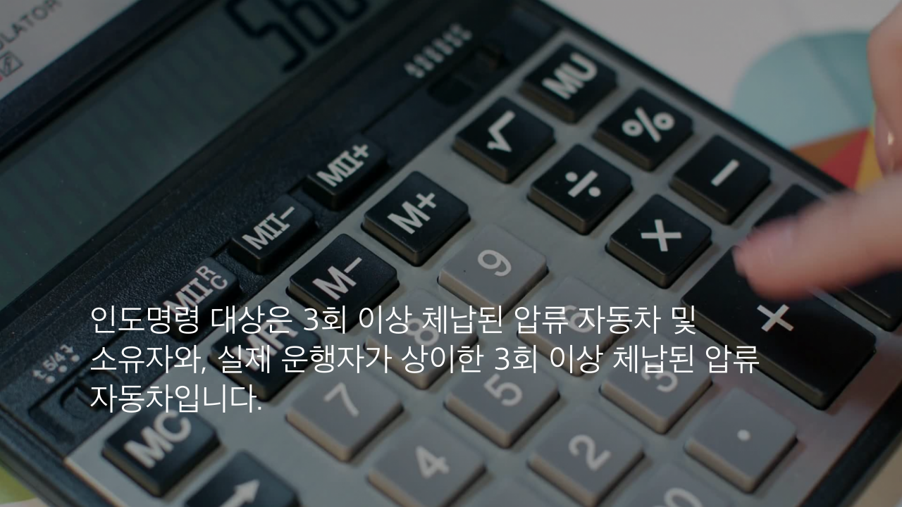 인도명령 대상은 3회 이상 체납된 압류 자동차 및 소유자와, 실제 운행자가 상이한 3회 이상 체납된 압류 자동차입니다.