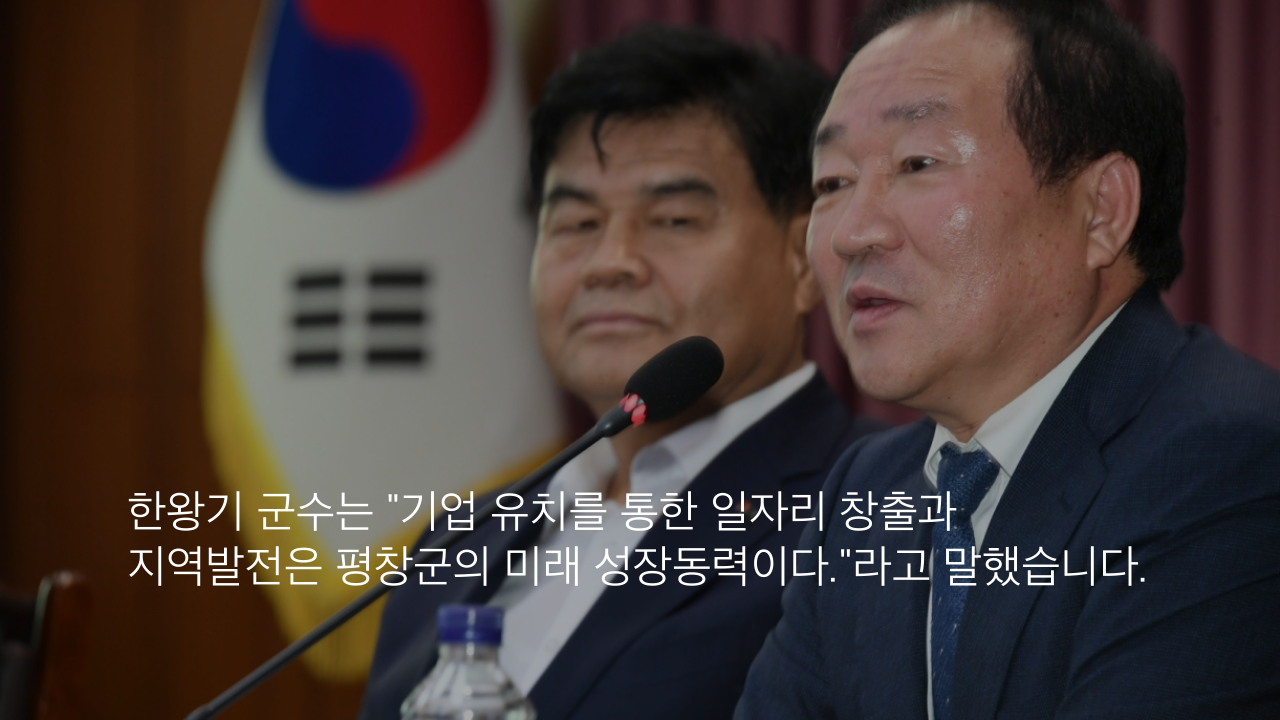 한왕기 군수는 "기업 유치를 통한 일자리 창출과 지역발전은 평창군의 미래 성장동력이다."라고 말했습니다.