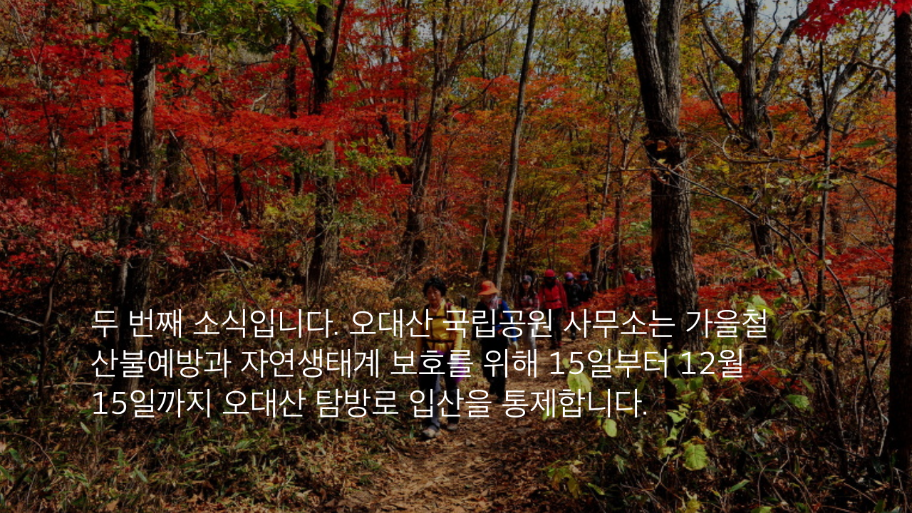 두 번째 소식입니다. 오대산 국립공원 사무소는 가을철 산불예방과 자연생태계 보호를 위해 15일부터 12월 15일까지 오대산 탐방로 입산을 통제합니다.