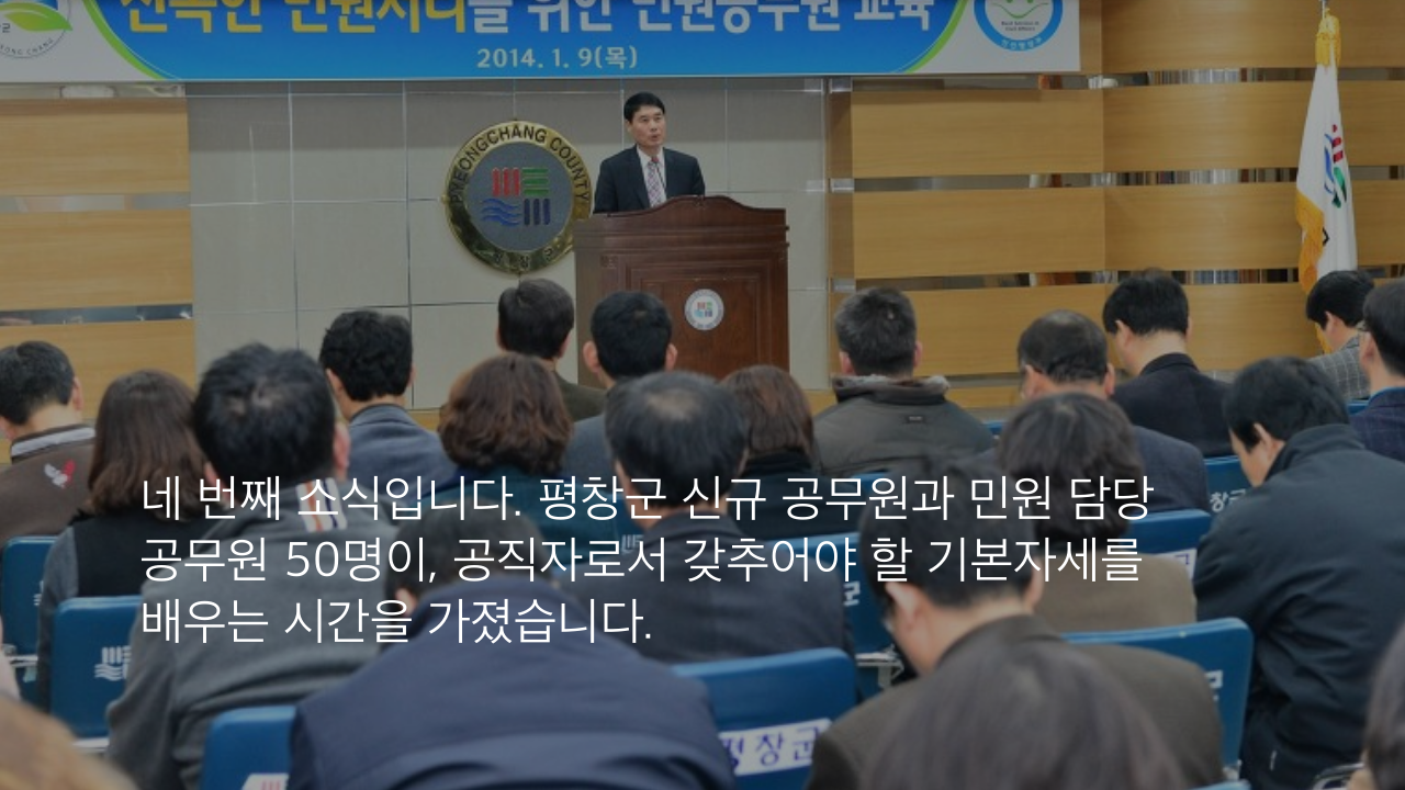 네 번째 소식입니다. 평창군 신규 공무원과 민원 담당 공무원 50명이, 공직자로서 갖추어야 할 기본자세를 배우는 시간을 가졌습니다.