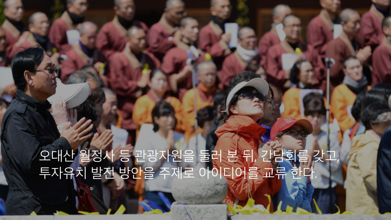 오대산 월정사 등 관광자원을 둘러 본 뒤, 간담회를 갖고, 투자유치 발전 방안을 주제로 아이디어를 교류 한다.