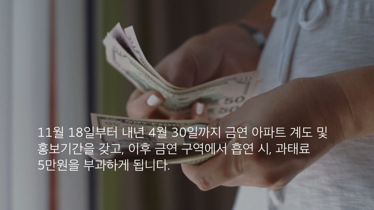 11월 18일부터 내년 4월 30일까지 금연 아파트 계도 및 홍보기간을 갖고, 이후 금연 구역에서 흡연 시, 과태료 5만원을 부과하게 됩니다.