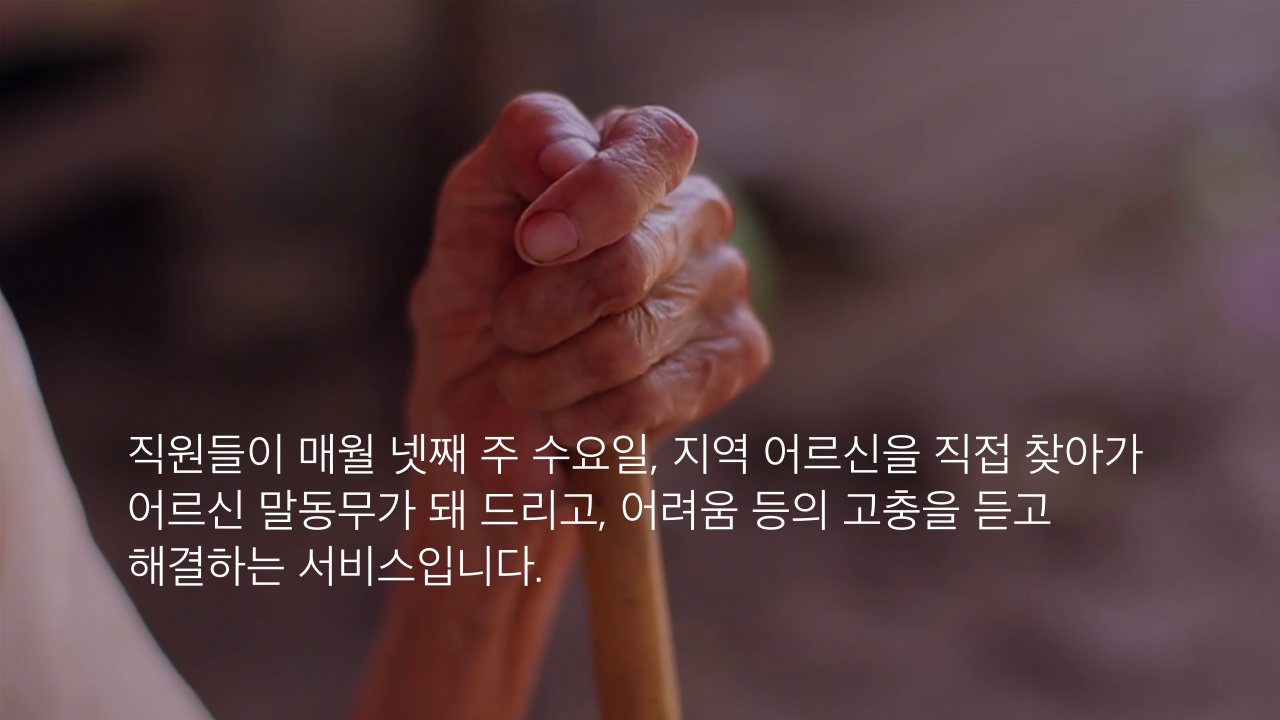 직원들이 매월 넷째 주 수요일, 지역 어르신을 직접 찾아가 어르신 말동무가 돼 드리고, 어려움 등의 고충을 듣고 해결하는 서비스입니다.