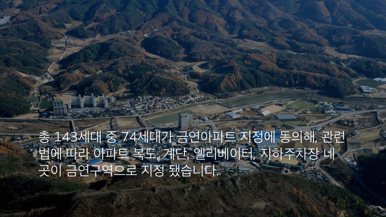 총 143세대 중 74세대가 금연아파트 지정에 동의해, 관련 법에 따라 아파트 복도, 계단, 엘리베이터, 지하주차장 네 곳이 금연구역으로 지정 됐습니다.
