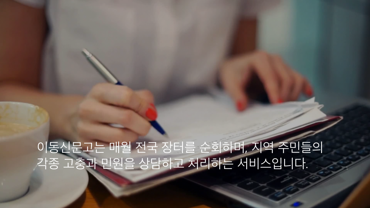 이동신문고는 매월 전국 장터를 순회하며, 지역 주민들의 각종 고충과 민원을 상담하고 처리하는 서비스입니다.