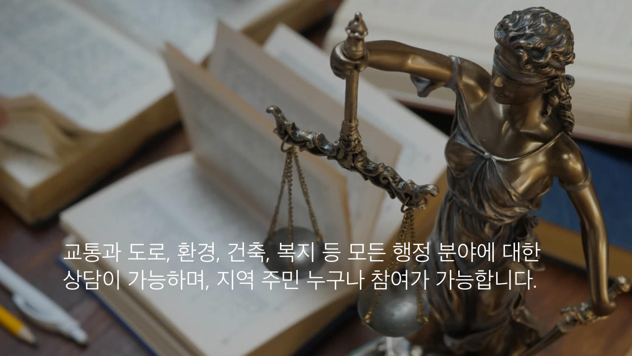 교통과 도로, 환경, 건축, 복지 등 모든 행정 분야에 대한 상담이 가능하며, 지역 주민 누구나 참여가 가능합니다.