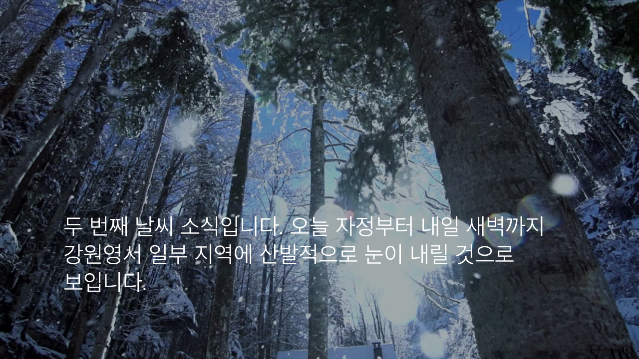 두 번째 날씨 소식입니다. 오늘 자정부터 내일 새벽까지 강원영서 일부 지역에 산발적으로 눈이 내릴 것으로 보입니다.