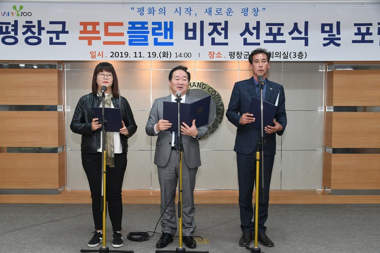 평창군은 19일 군청 대회의실에서 한왕기 군수와 지역 도․군의원 등을 비롯해 이정삼 농림축산식품부 유통정책과장, 황민영 식생활교육국민네트워크 상임대표 등이 참석한 가운데 푸드플랜 비전 선포식 및 포럼을 개최하였다.