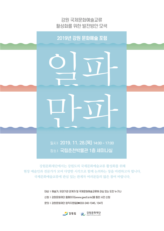 (재)강원문화재단(대표이사 김필국)은 강원도의 국제문화예술교류 활성화를 위한 발전방향을 모색하기 위하여 ‘2019년 강원 문화예술포럼 <일파만파>’를 오는 11월 28일 2시부터 국립춘천박물관 1층 세미나실에서 개최한다.