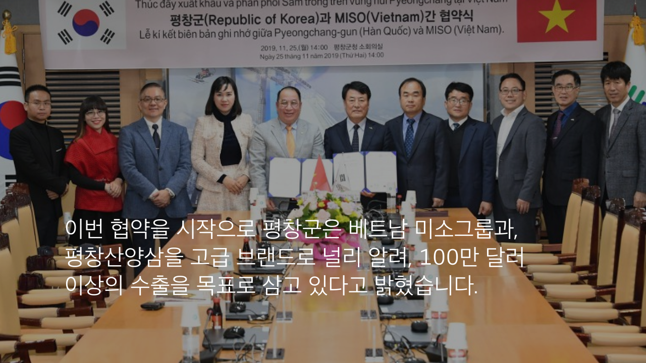 이번 협약을 시작으로 평창군은 베트남 미소그룹과, 평창산양삼을 고급 브랜드로 널리 알려, 100만 달러 이상의 수출을 목표로 삼고 있다고 밝혔습니다.