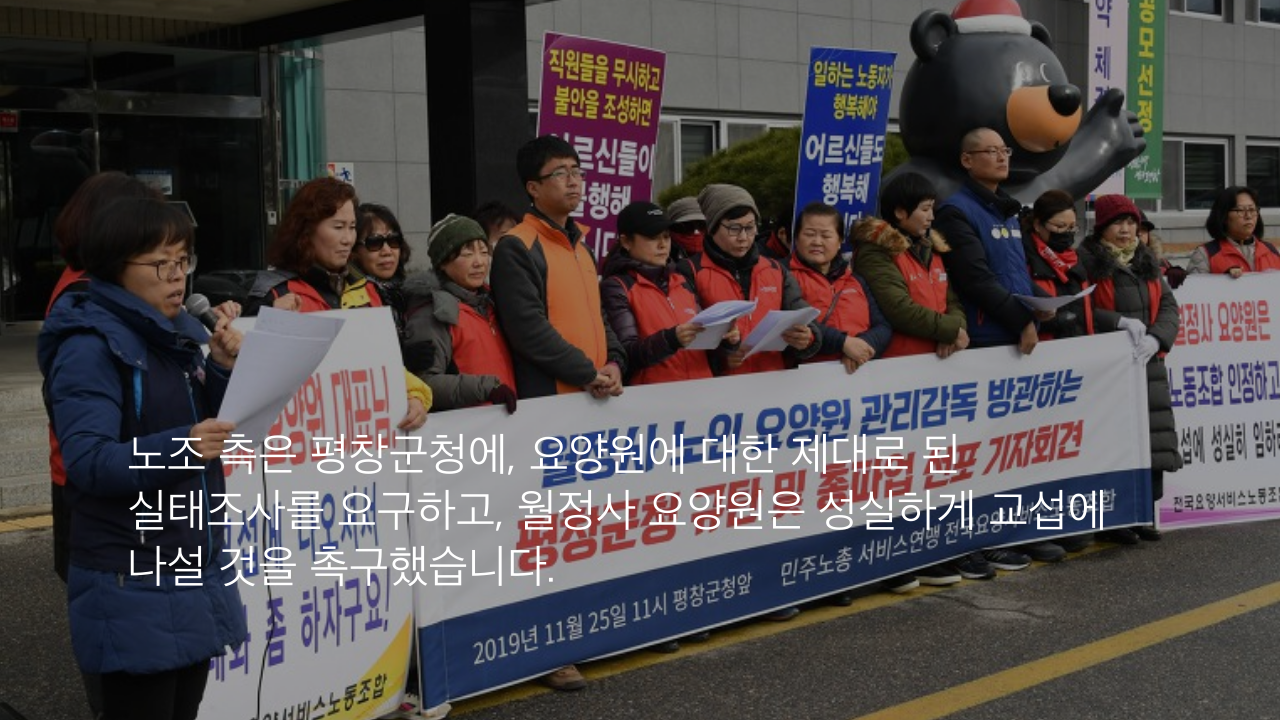 노조 측은 평창군청에, 요양원에 대한 제대로 된 실태조사를 요구하고, 월정사 요양원은 성실하게 교섭에 나설 것을 촉구했습니다.