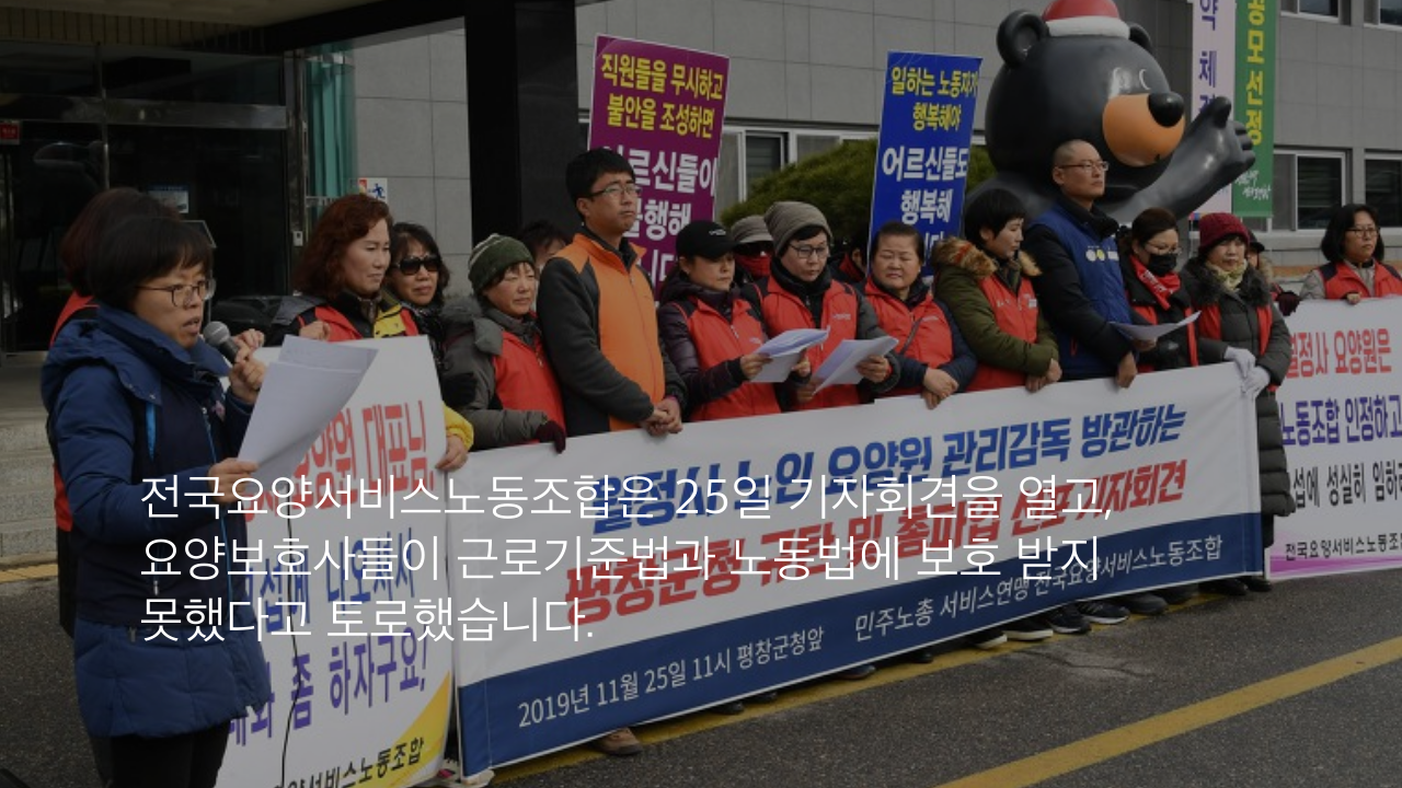전국요양서비스노동조합은 25일 기자회견을 열고, 요양보호사들이 근로기준법과 노동법에 보호 받지 못했다고 토로했습니다.