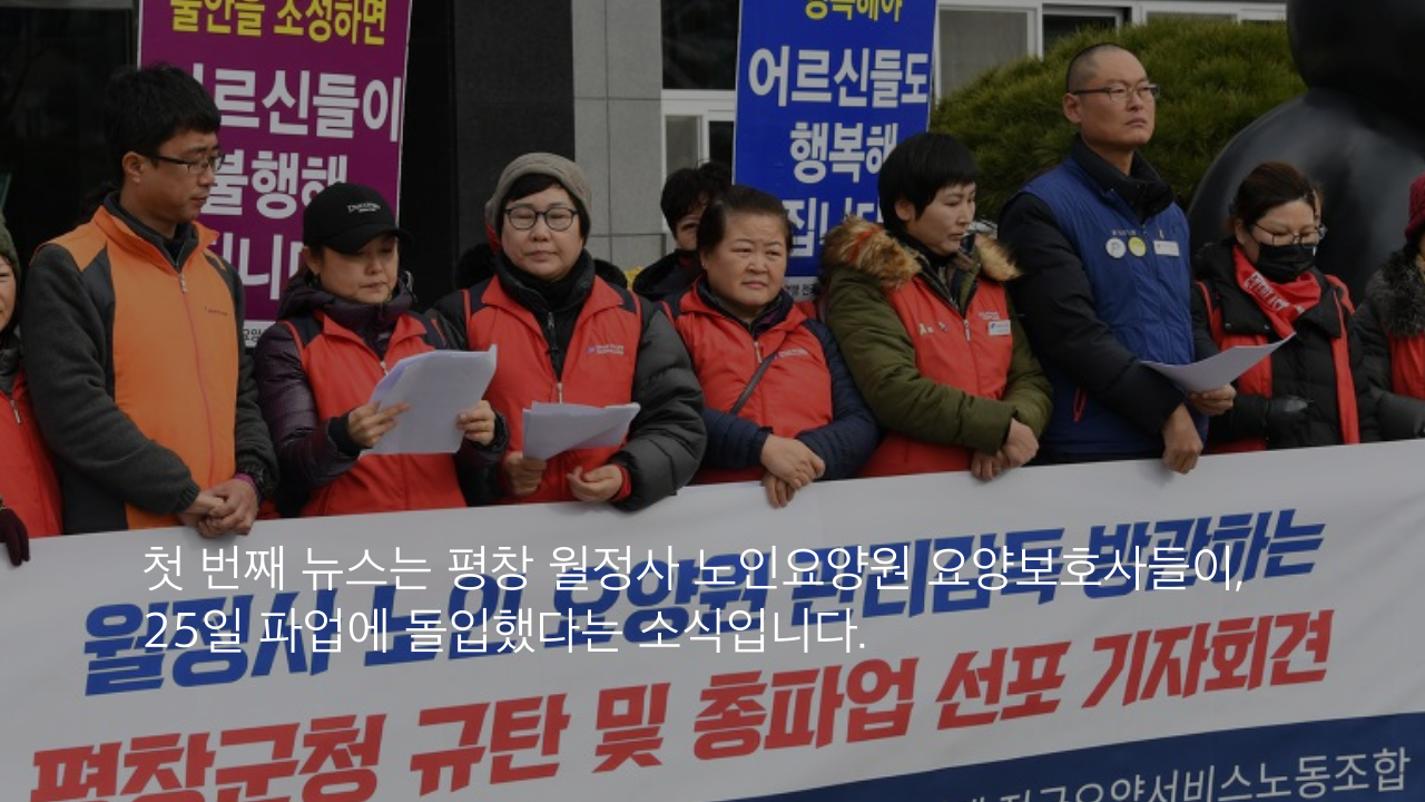 첫 번째 뉴스는 평창 월정사 노인요양원 요양보호사들이, 25일 파업에 돌입했다는 소식입니다.
