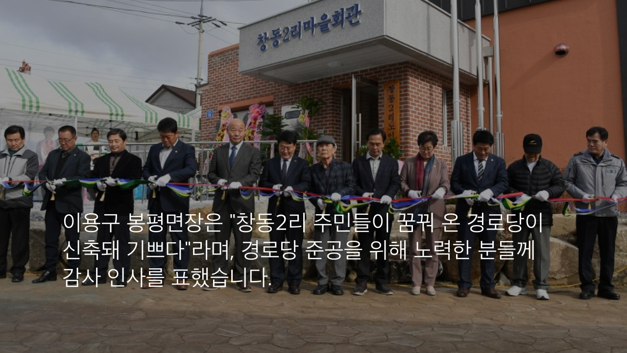 이용구 봉평면장은 "창동2리 주민들이 꿈꿔 온 경로당이 신축돼 기쁘다"라며, 경로당 준공을 위해 노력한 분들께 감사 인사를 표했습니다.