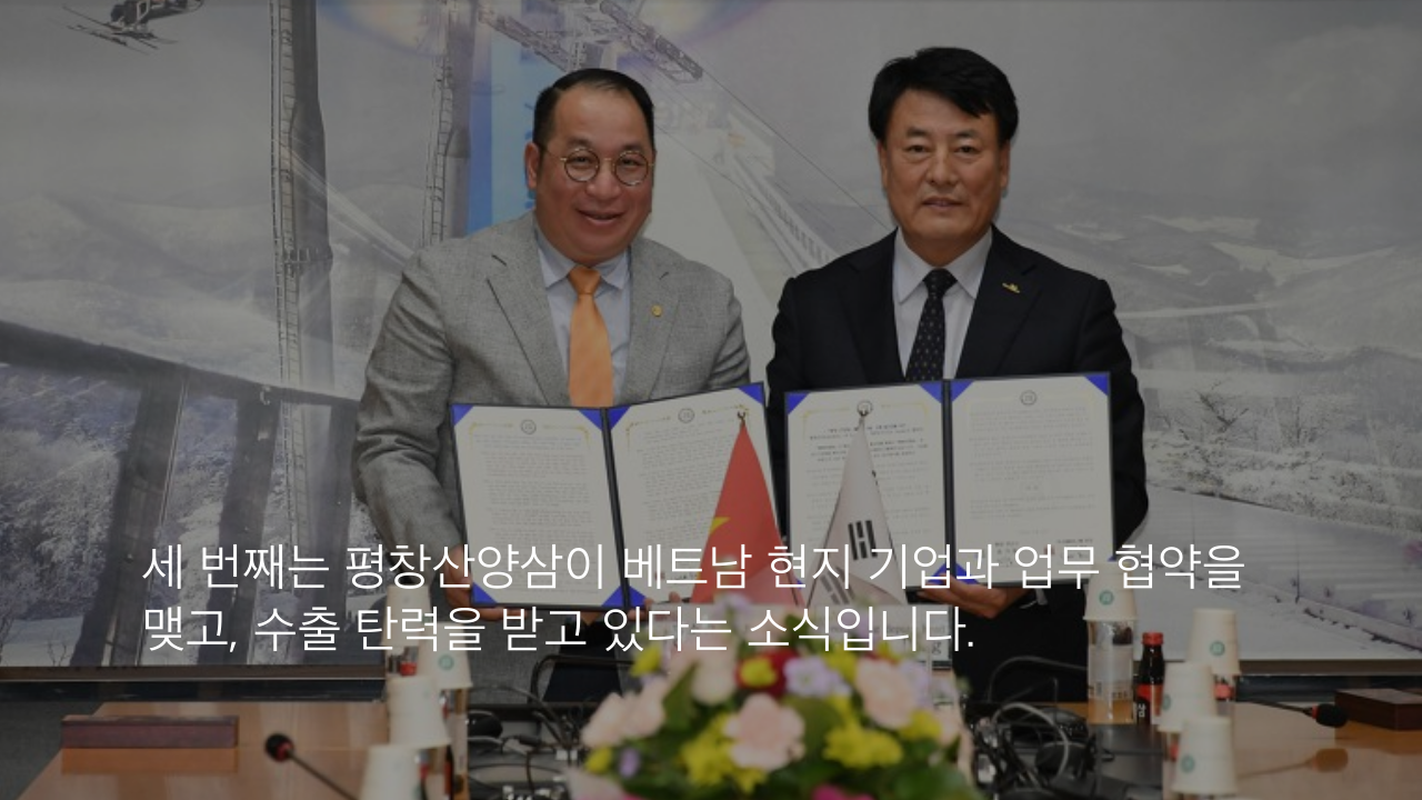 세 번째는 평창산양삼이 베트남 현지 기업과 업무 협약을 맺고, 수출 탄력을 받고 있다는 소식입니다.