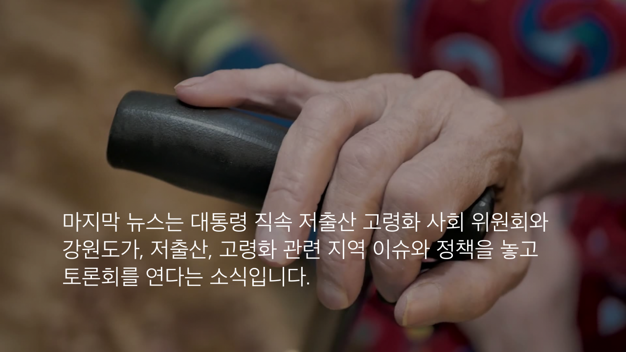 마지막 뉴스는 대통령 직속 저출산 고령화 사회 위원회와 강원도가, 저출산, 고령화 관련 지역 이슈와 정책을 놓고 토론회를 연다는 소식입니다.