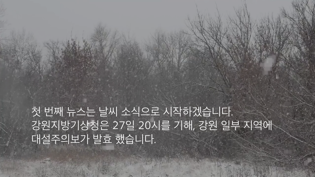 첫 번째 뉴스는 날씨 소식으로 시작하겠습니다. 강원지방기상청은 27일 20시를 기해, 강원 일부 지역에 대설주의보가 발효 했습니다.