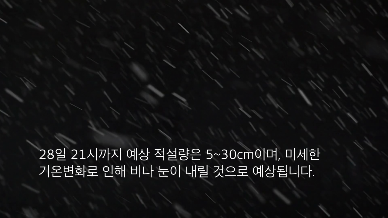 28일 21시까지 예상 적설량은 5~30cm이며, 미세한 기온변화로 인해 비나 눈이 내릴 것으로 예상됩니다.