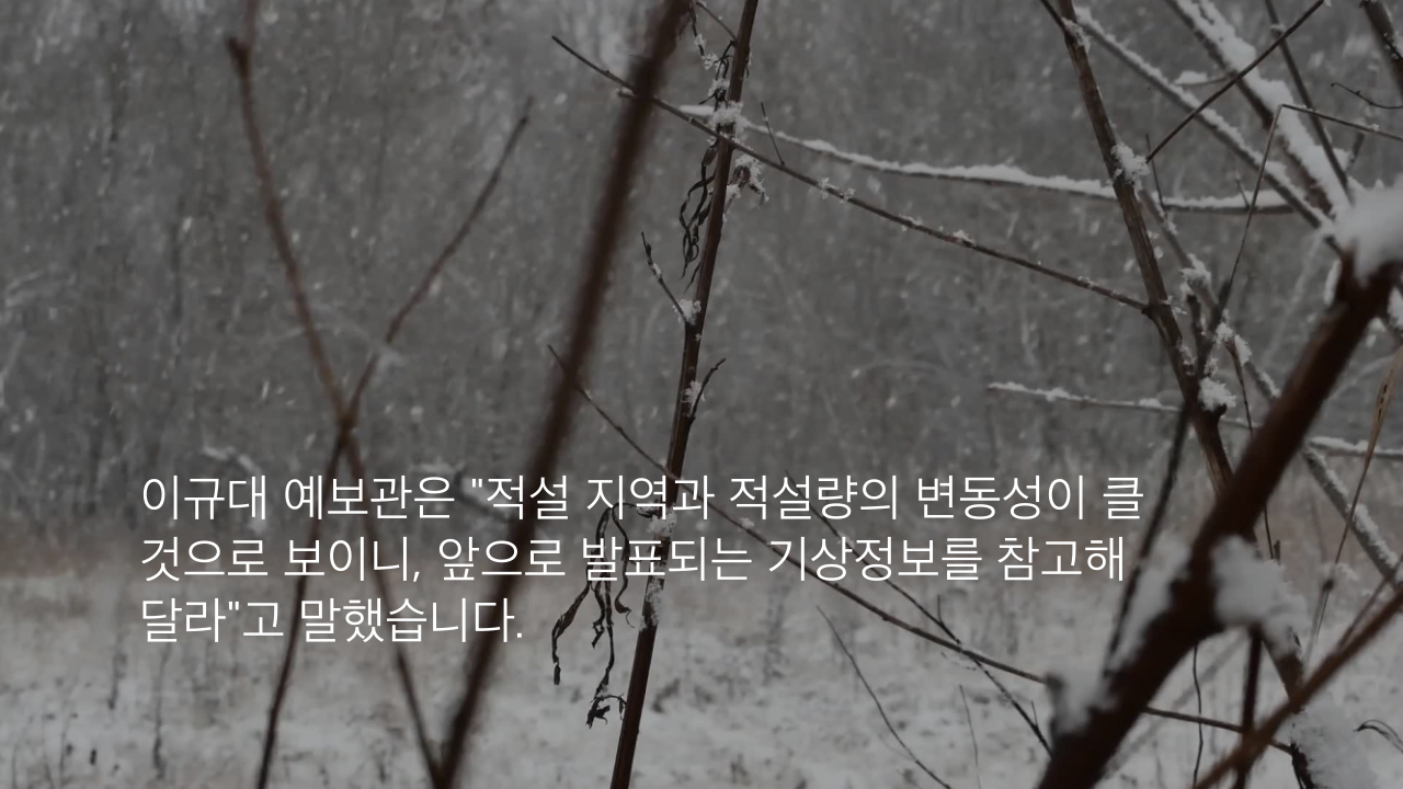 이규대 예보관은 "적설 지역과 적설량의 변동성이 클 것으로 보이니, 앞으로 발표되는 기상정보를 참고해 달라"고 말했습니다.