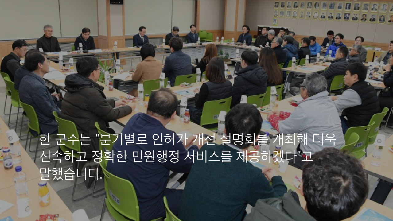 한 군수는 "분기별로 인허가 개선 설명회를 개최해 더욱 신속하고 정확한 민원행정 서비스를 제공하겠다"고 말했습니다.