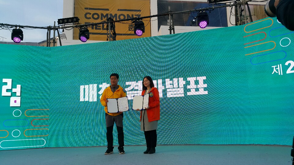 마지막으로 파킹쉐어링(공유주차장) 의제를 제안한 ‘효자동사람들’팀(대표 허인범)은 강원대학교 관광경영학과 학생들로 이루어졌다. 이날 발표를 진행한 양현석 학생은 강원대학교 인근 원룸촌의 이면도로 주차로 인해 혼잡한 골목길과 필로티 공법으로 건축한 원룸 건물 1층의 텅 빈 주차장 사진을 보여주며, 주차공간의 부족이 절대적 부족이 아닌 상대적 부족임을 설명했다. 이를 해결하는 방안으로 빈 주차장을 공유하는 방안을 제안했고, 이를 실행한 결과 80%의 이면도로 주차 차량이 감소한 점을 강조했다. 본 의제는 도로교통공단과 매칭되었다.