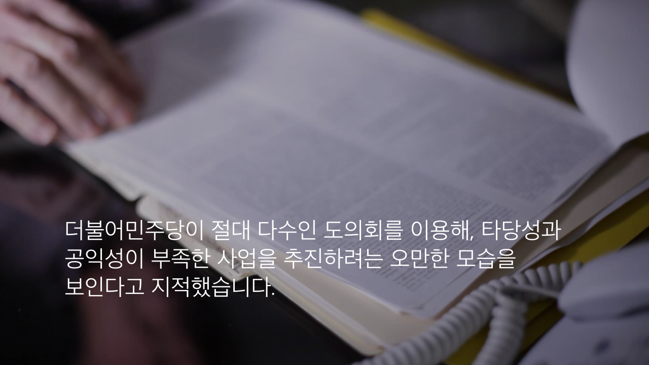 더불어민주당이 절대 다수인 도의회를 이용해, 타당성과 공익성이 부족한 사업을 추진하려는 오만한 모습을 보인다고 지적했습니다.