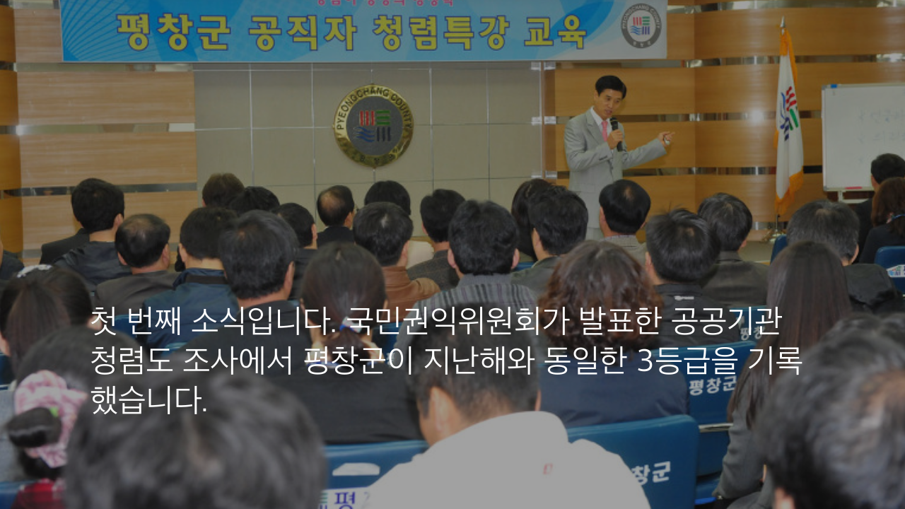 첫 번째 소식입니다. 국민권익위원회가 발표한 공공기관 청렴도 조사에서 평창군이 지난해와 동일한 3등급을 기록 했습니다.