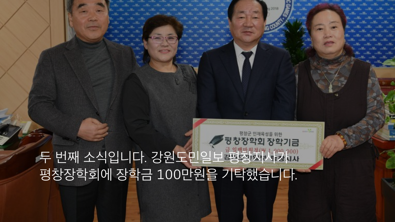 두 번째 소식입니다. 강원도민일보 평창지사가 평창장학회에 장학금 100만원을 기탁했습니다.