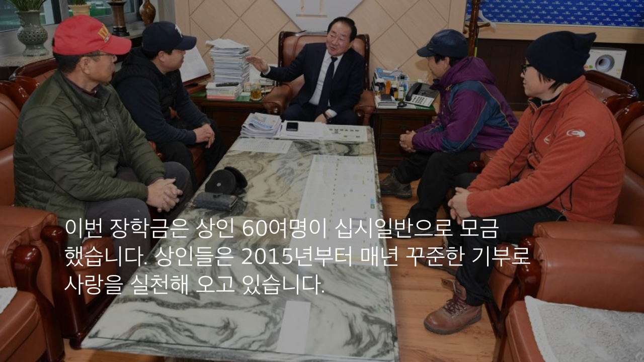 이번 장학금은 상인 60여명이 십시일반으로 모금 했습니다. 상인들은 2015년부터 매년 꾸준한 기부로 사랑을 실천해 오고 있습니다.