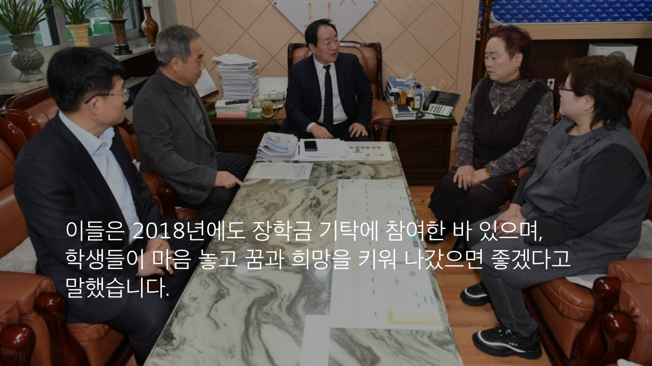 이들은 2018년에도 장학금 기탁에 참여한 바 있으며, 학생들이 마음 놓고 꿈과 희망을 키워 나갔으면 좋겠다고 말했습니다.