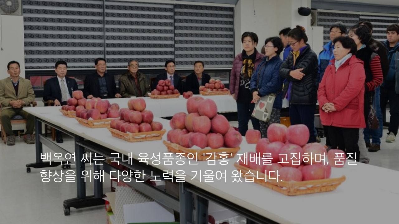 백옥연 씨는 국내 육성품종인 '감홍' 재배를 고집하며, 품질 향상을 위해 다양한 노력을 기울여 왔습니다.