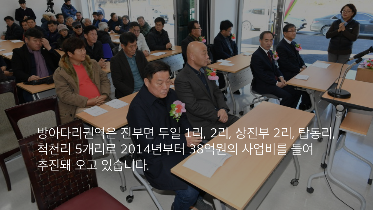 방아다리권역은 진부면 두일 1리, 2리, 상진부 2리, 탑동리, 척천리 5개리로 2014년부터 38억원의 사업비를 들여 추진돼 오고 있습니다.