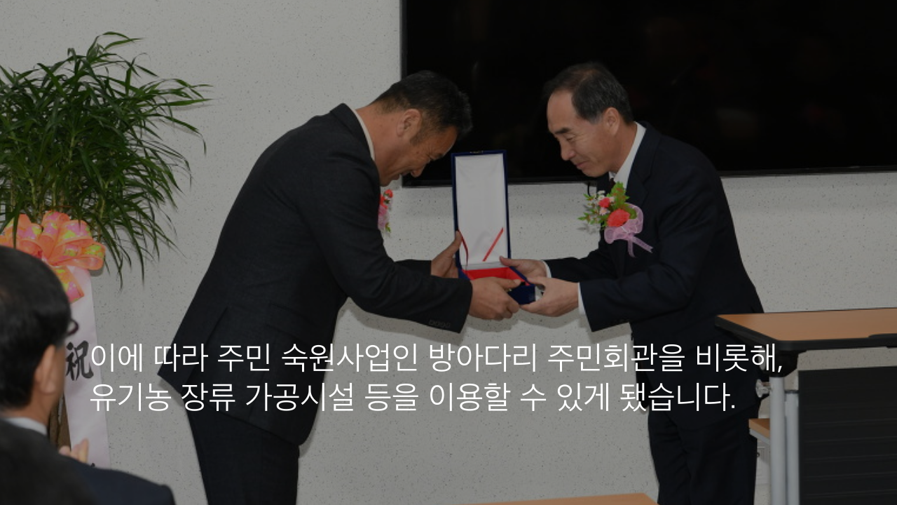 이에 따라 주민 숙원사업인 방아다리 주민회관을 비롯해, 유기농 장류 가공시설 등을 이용할 수 있게 됐습니다.