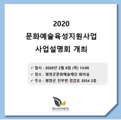 한편, 2020 문화예술육성지원 사업설명회를 오는 2월 6일 평창군문화예술재단 회의실에서 개최하며, 지원사업 안내 및 일정 소개와 신청서 작성 방법 등을 비롯해 예술인활동증명 발급 방법안내 등에 대한 설명회가 진행된다. 본 사업 설명회는 예술 단체 및 개인 등 누구나 참석 가능하다.