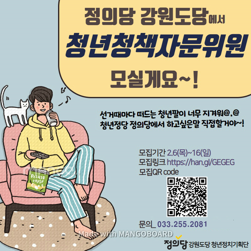 정의당 강원도당 청년정치기획단에서 청년정책자문위원을 모집한다.