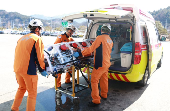 평창소방서는 7일부터 신종 코로나 바이러스의 확산 기간동안 ‘음압형 환자 이송들것’을 코로나 확진 환자의 경우 사용하게 된다고 밝혔다.