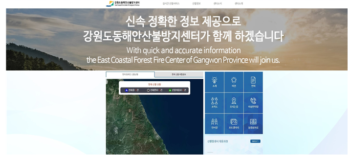 강원도동해안산불방지센터 홈페이지(http://forestfire.gwd.go.kr)는 동해안 6개 시군의 실시간 산불발생 및 진화현황, 지역별 산불위험정보, 산불관련 통계 및 국민행동요령, 사진, 동영상 등 다양한 서비스를 수록했다.