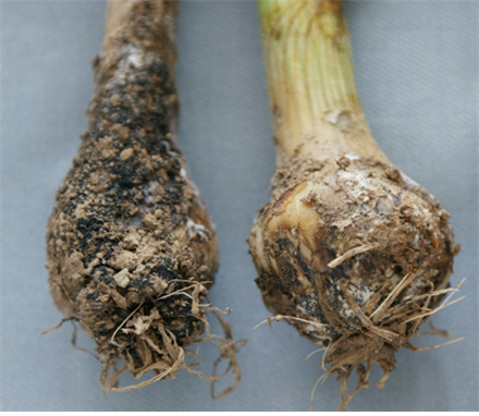 흑색썩음균핵병에 감염된 양파와 마늘은 아랫잎부터 색이 황갈색으로 변한다흑색썩음균핵병 습한 토양에서 피해가 더 크므로 물 빠짐(배수) 관리와 함께 병해에 효과가 있는 살균제를 뿌려야 한다.
