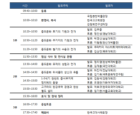 올해 제3회 심포지엄에서는 강원지역 고고학, 문헌사의 최대 이슈인 중도 문화를 주제로 고고학과 문헌사가 심도 있는 발표와 토론을 진행할 예정이다. 한국고고학회는 한국 고고학계를 대표하는 학회로 3개년 프로젝트의 마지막을 장식하는 뜻 깊은 해에 5개 분야, 5인의 발표로 참여하게 되었으며, 한국고대사학회는 올해도 2개 분야의 문헌사 연구 성과를 통해 강원 고대문화를 살피는데 기여할 것으로 기대된다. 이번 심포지엄은 6월 말 국립춘천박물관 대강당에서 개최 예정이다.