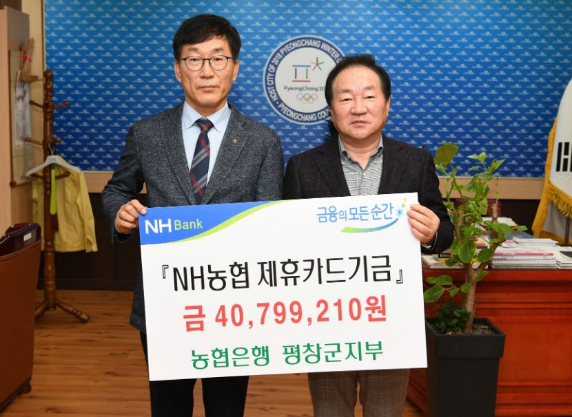 NH농협은행 평창군지부장 최두헌은 지난 28일 평창군을 방문하여 2019년분 농협제휴카드 발생기금 40,799,210원을 전달하였다.